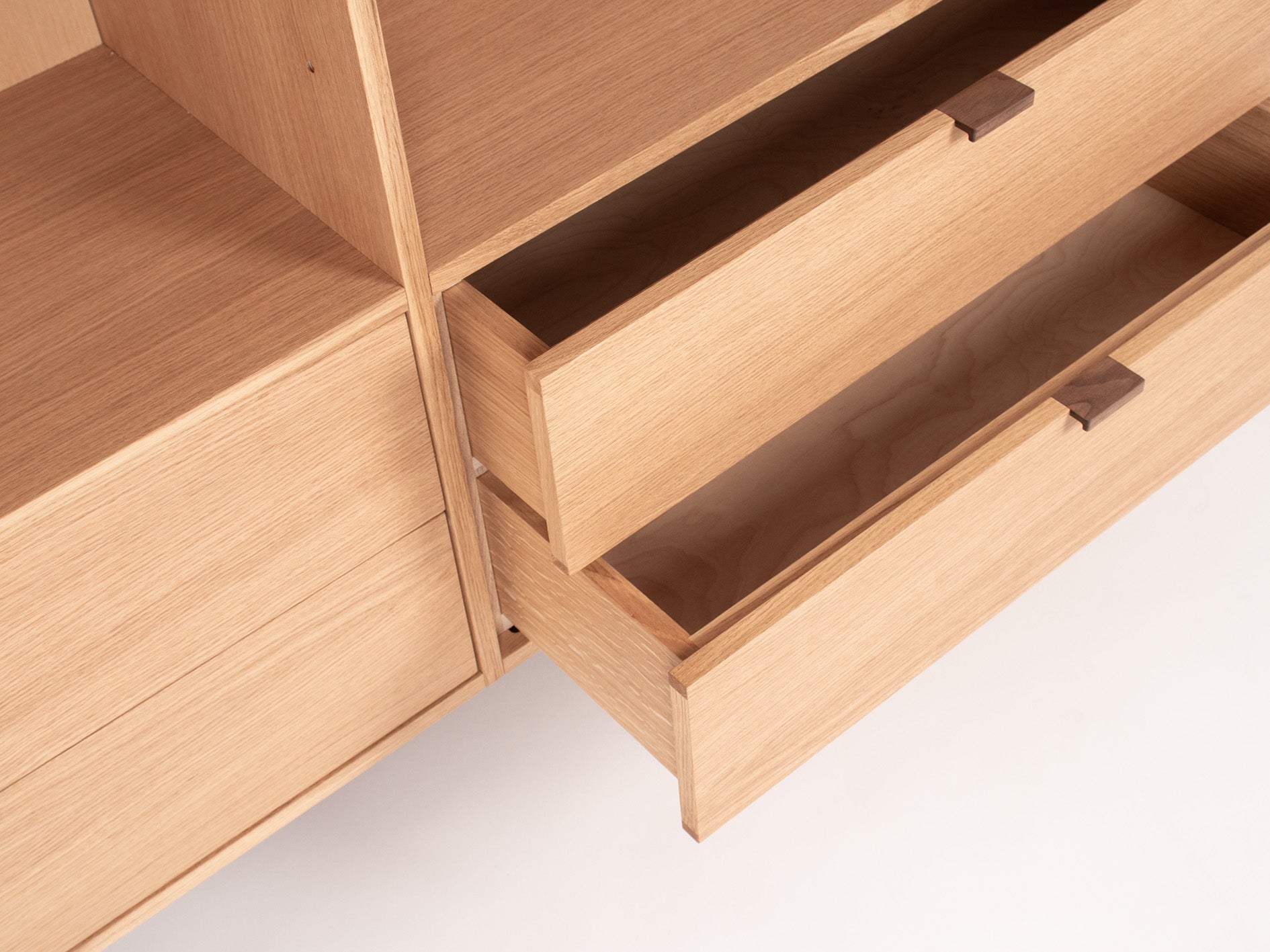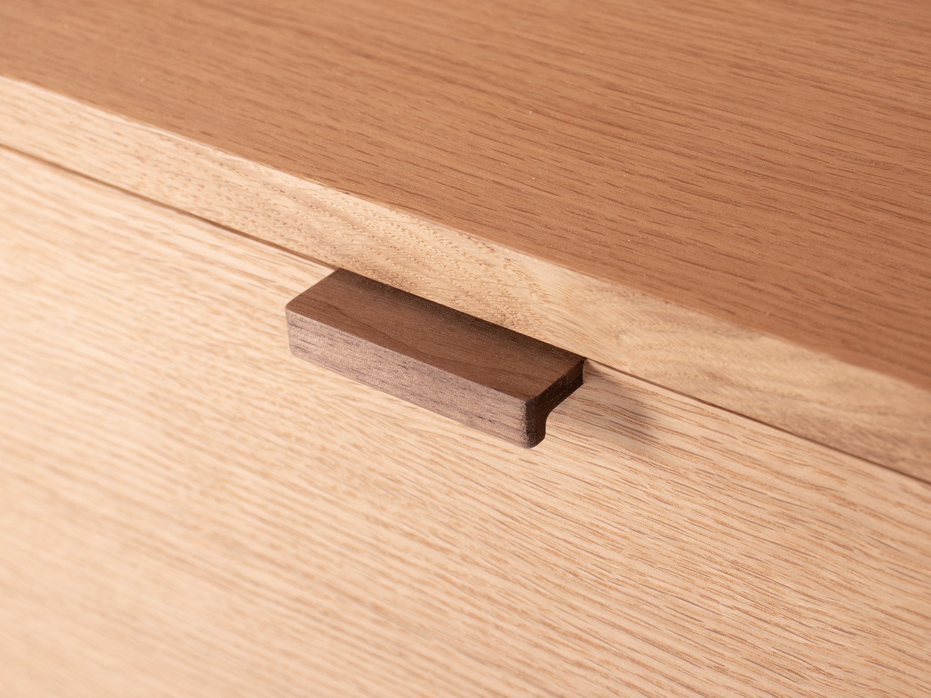 Our tall cabinet consists of a solid oak leg frame with exposed mortise and tenon joinery. The main body is made from high quality birch plywood faced and edged in ash and oak. Four drawers slide on waxed oak runners with naturally dark contrasting walnut handles.